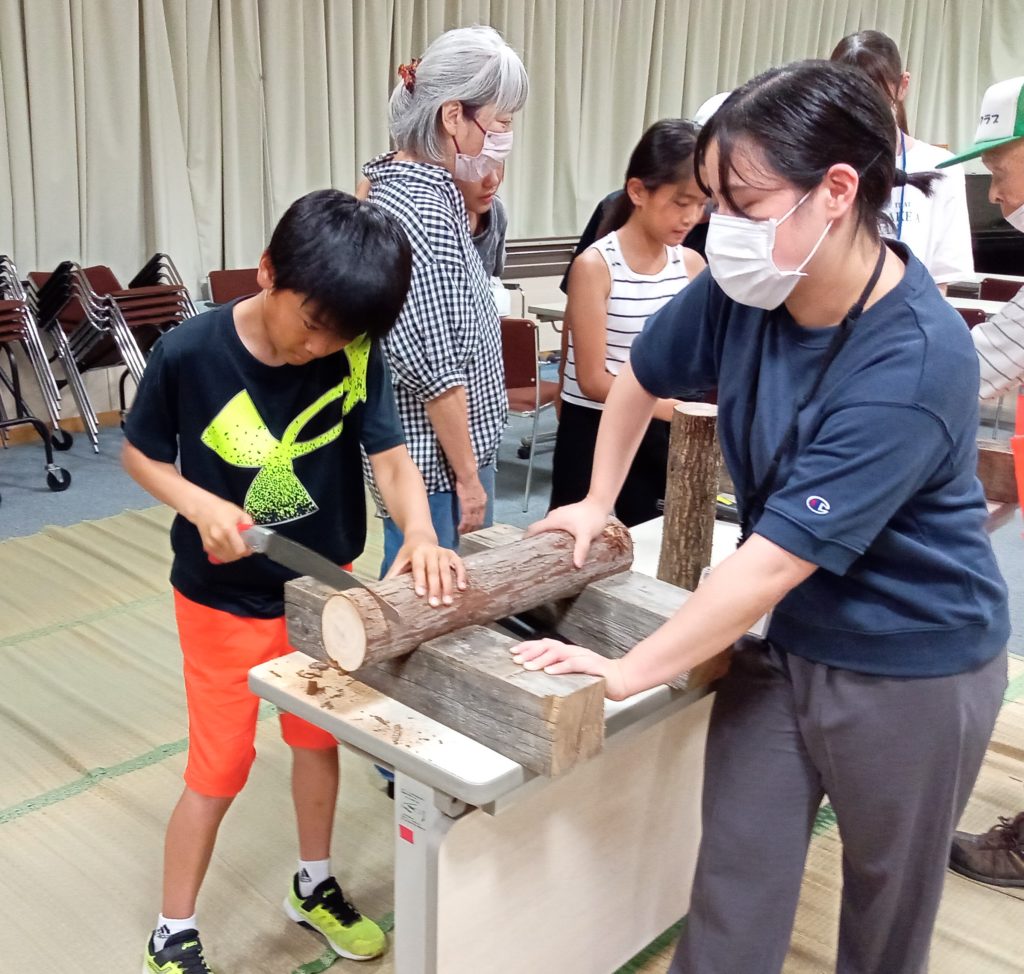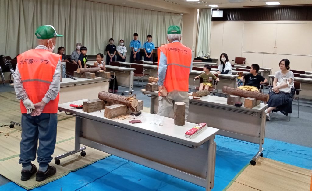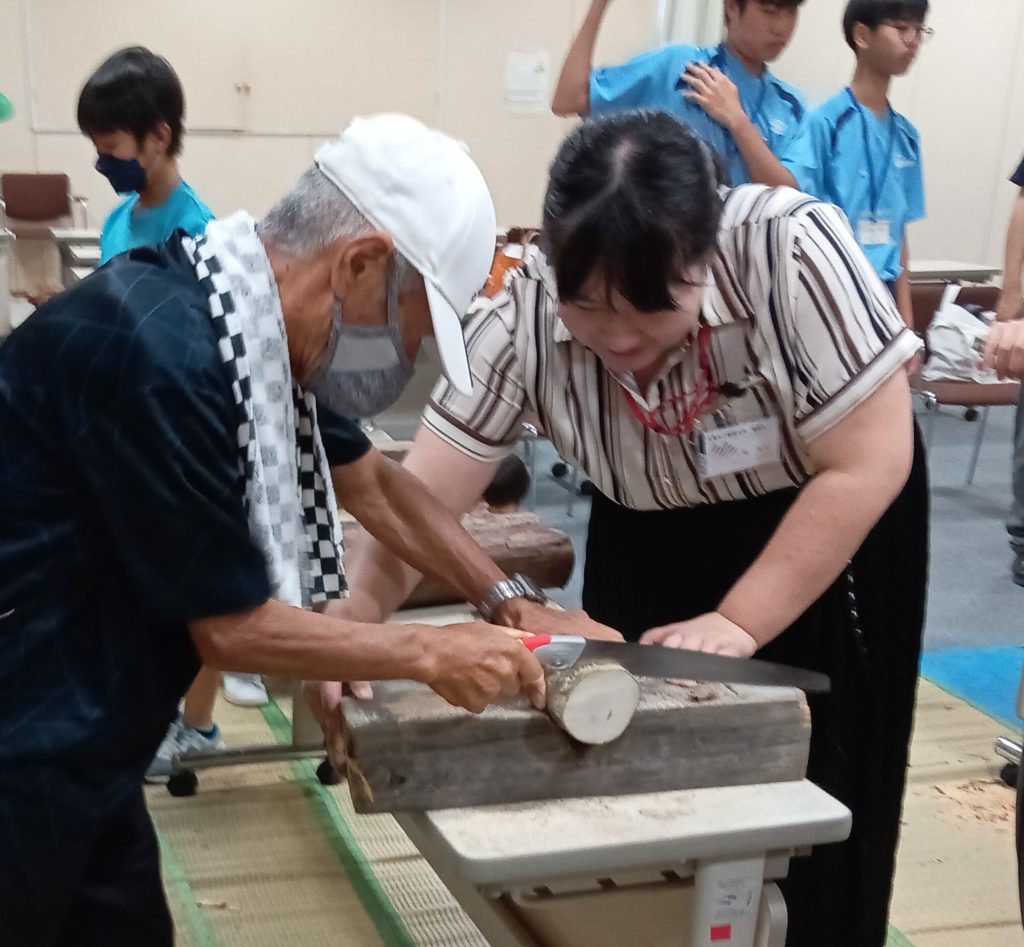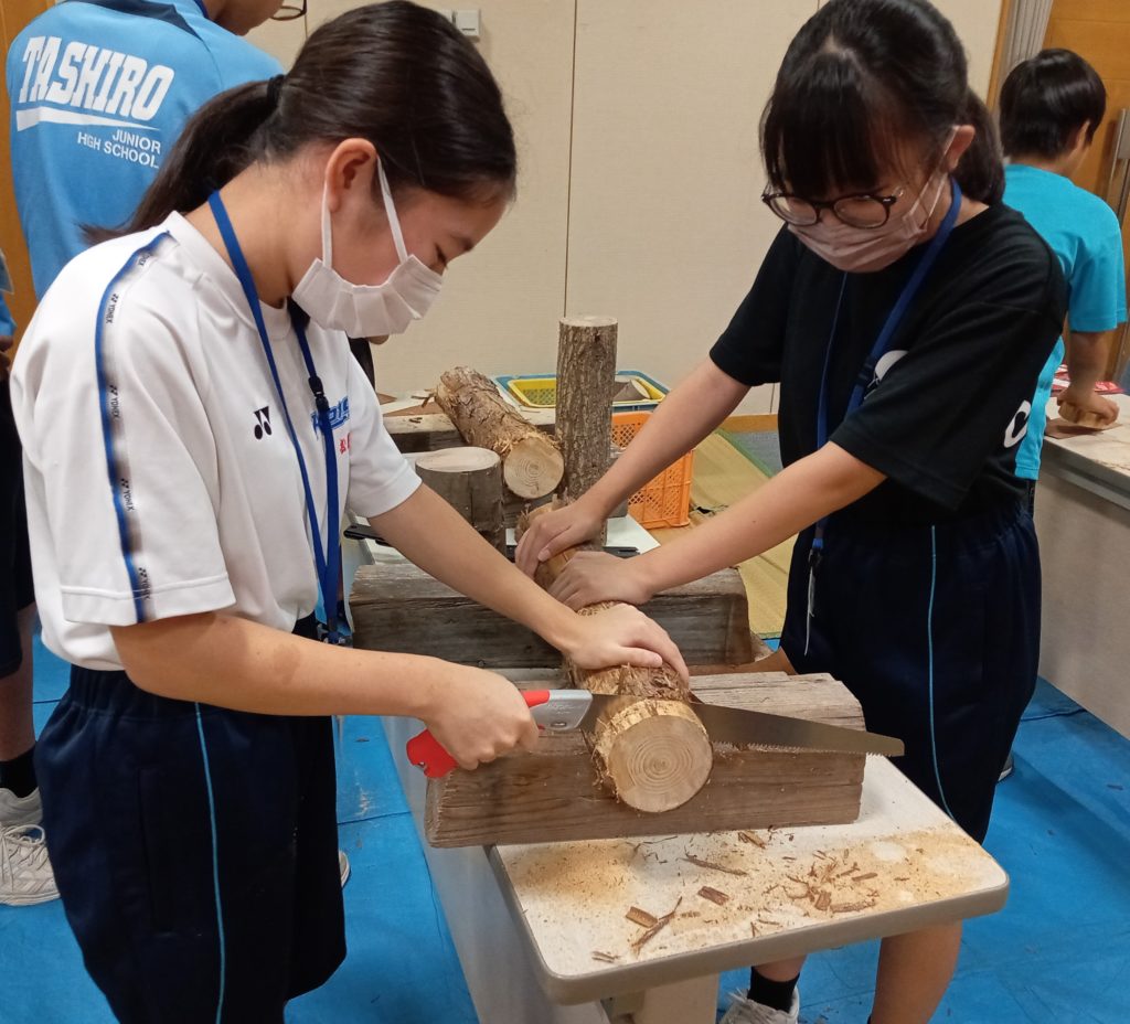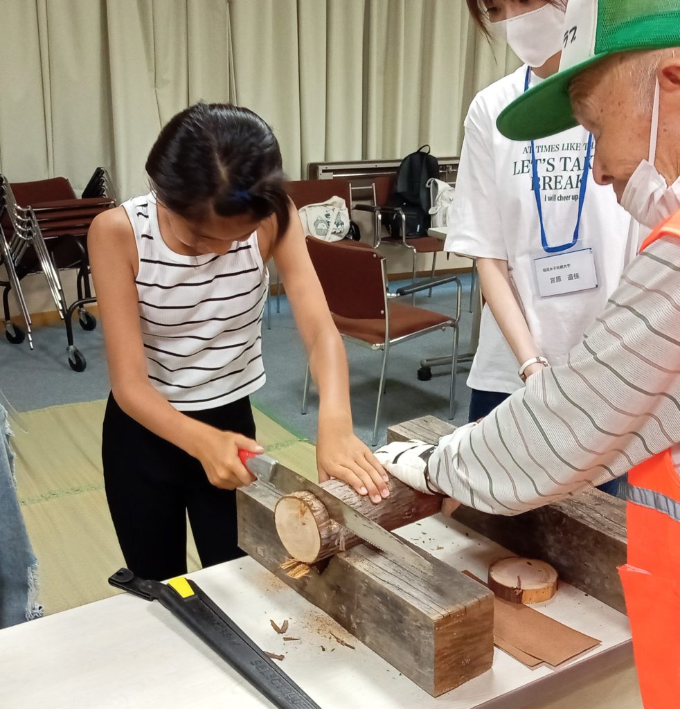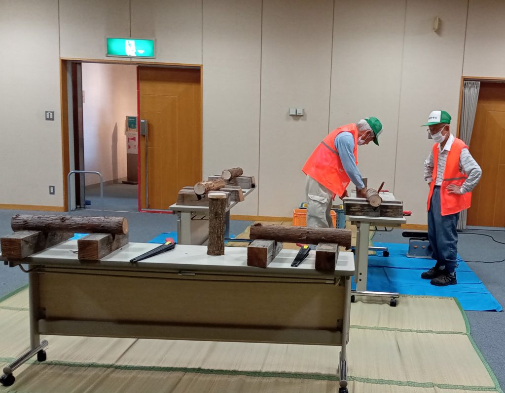 ヒノキなどの木の幹をノコギリで切断します。