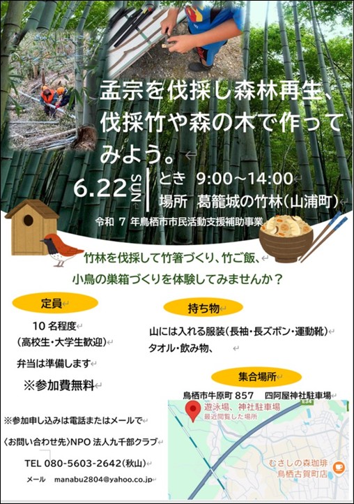 5月19日(月) 【令和7年度鳥栖市市民活動支援事業の{孟宗竹を伐採し森林再生、伐採竹や森の木で作ってみよう。}】の第2回目の募集案内 森林・農地整備活用事業 X Facebook はてブ LINE コピー 2025.05.21 目次 過去の体験教室鉛筆作り笛作りお箸作り巣箱作り 過去の体験教室 鉛筆作り 笛作り お箸作り 巣箱作り 去年の巣箱に小鳥の孵化した証拠発見 巣箱の設置の様子