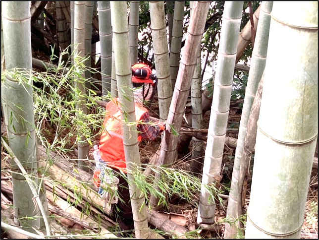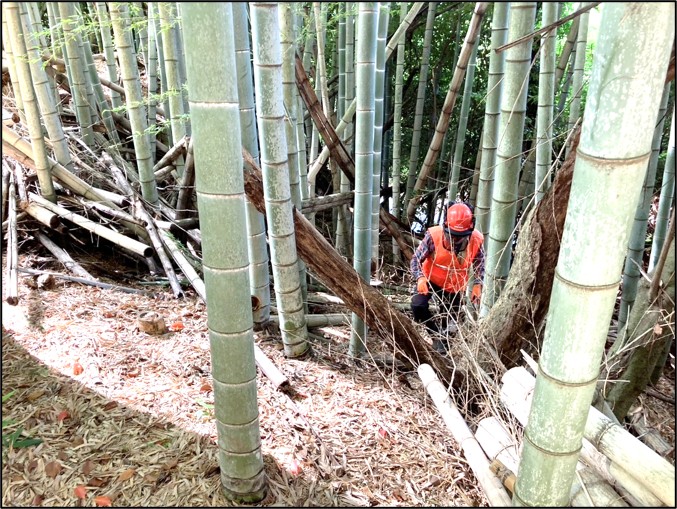 竹林に入り、倒竹を伐採しています