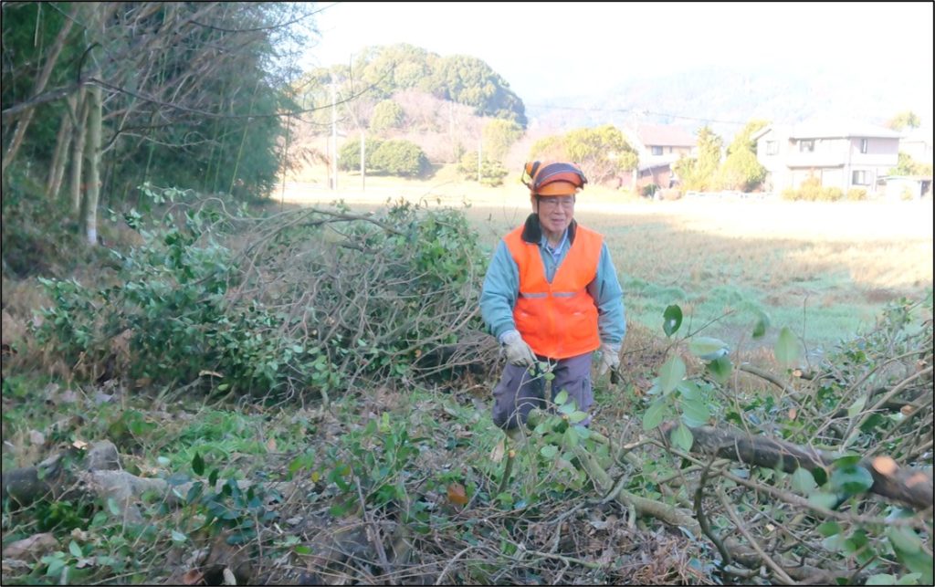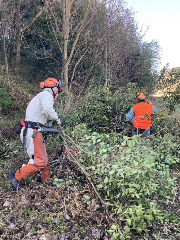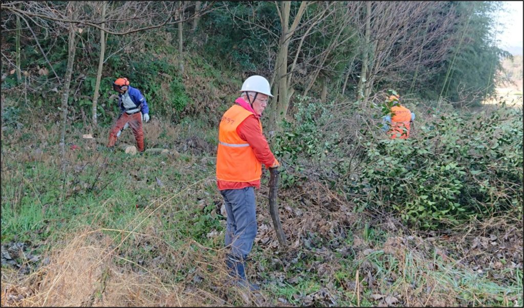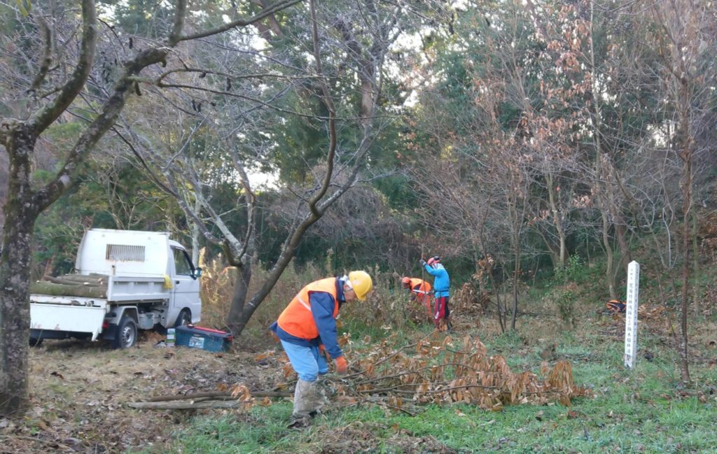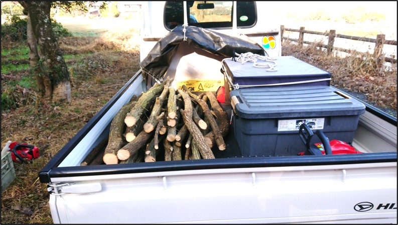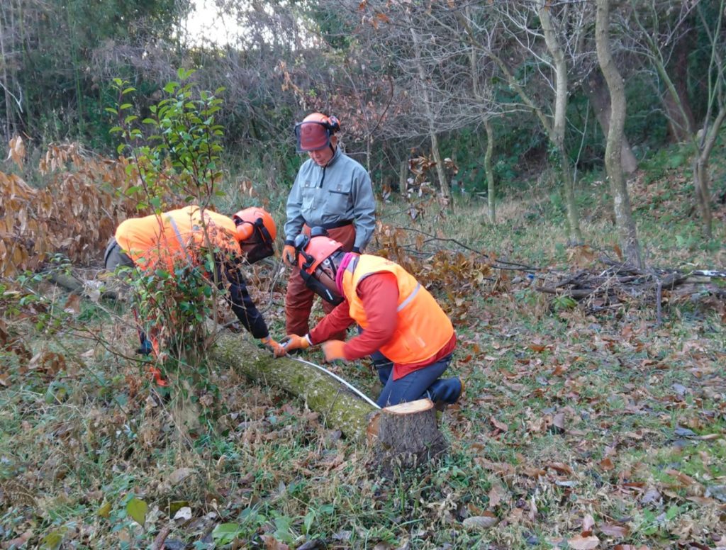 1月18日(日)  弥生が丘「ほんごう大池」の南側エリアにおいて、1月25日(日)の【県民参加の森林づくり】の【椎茸菌打ち】準備のため、クヌギの木3本を伐採し、約1.2mの長さに裁断
