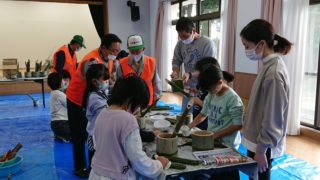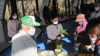 安全を十分に考慮して、孟宗竹の伐採開始です。真剣そのものです。孟宗竹の伐採後、「ミニ門松作り」に挑戦中です。立派な「ミニ門松」ができました。皆さん、お疲れ様でした。
